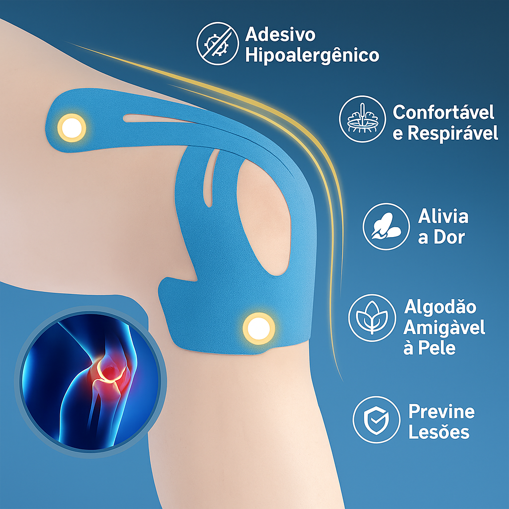A Fita Aliviadora de Joelho foi desenvolvida para quem sofre com dores musculares, articulares ou está se recuperando de lesões.